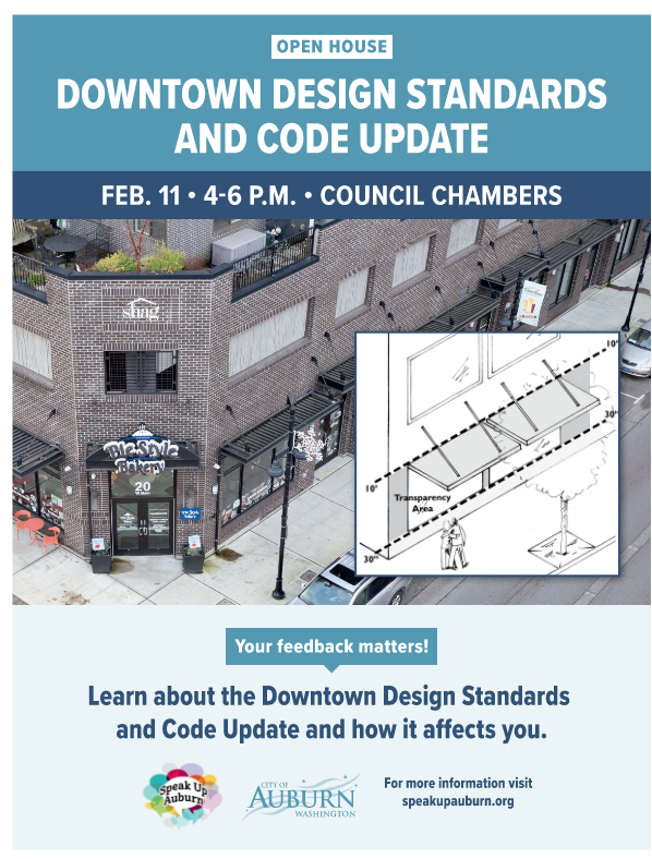 The City invites you to an upcoming open house on the Downtown Design Standards and Code Update. The meeting will be held 4 p.m. – 6 p.m. PST, February 11, 2026, at City Hall, Council Chambers - 25 W Main ST, Auburn, WA. The purpose of the meeting is to receive comments on the draft Downtown Design Standards and Code Update.